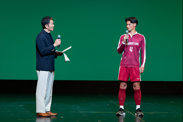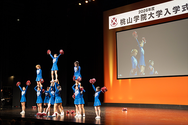 続いて行われた「桃大人」企画では、チアリーディング部の演技をはじめ、起業部、サッカー部、国際体験が豊富な学生、大衆演劇の活性化に尽力する学生など、第一線で活躍する5組の在学生が登壇し、本学の多様な学生像を紹介しました。