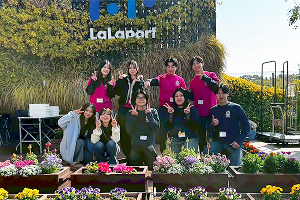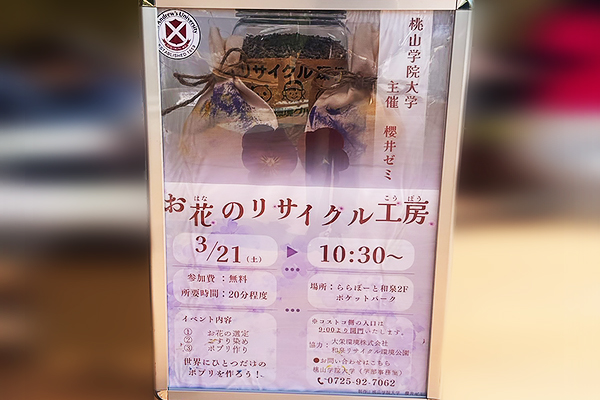 経営学部の櫻井ゼミでは、産官学連携・地域連携プロジェクトの企画と実践を行っています。その一環として3月21日(土)ららぽーと和泉において、和泉リサイクル環境公園(運営:大栄環境株式会社)よりご提供いただいた廃棄予定の花材を活用したイベントを開催しました。