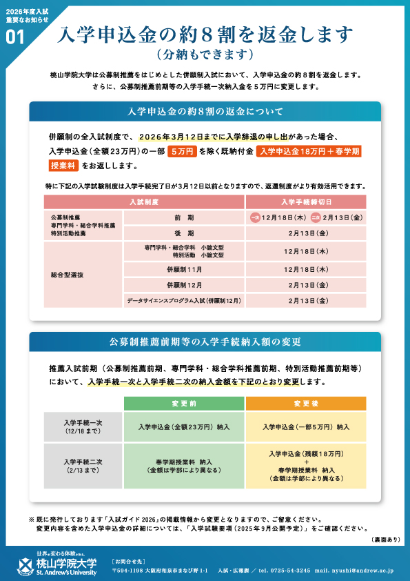 桃山学院大学では、2026年度入試(今年度実施) の公募制推薦をはじめとした併願制入試において、 入学申込金の[返金制度][分納制度]を新規導入します。